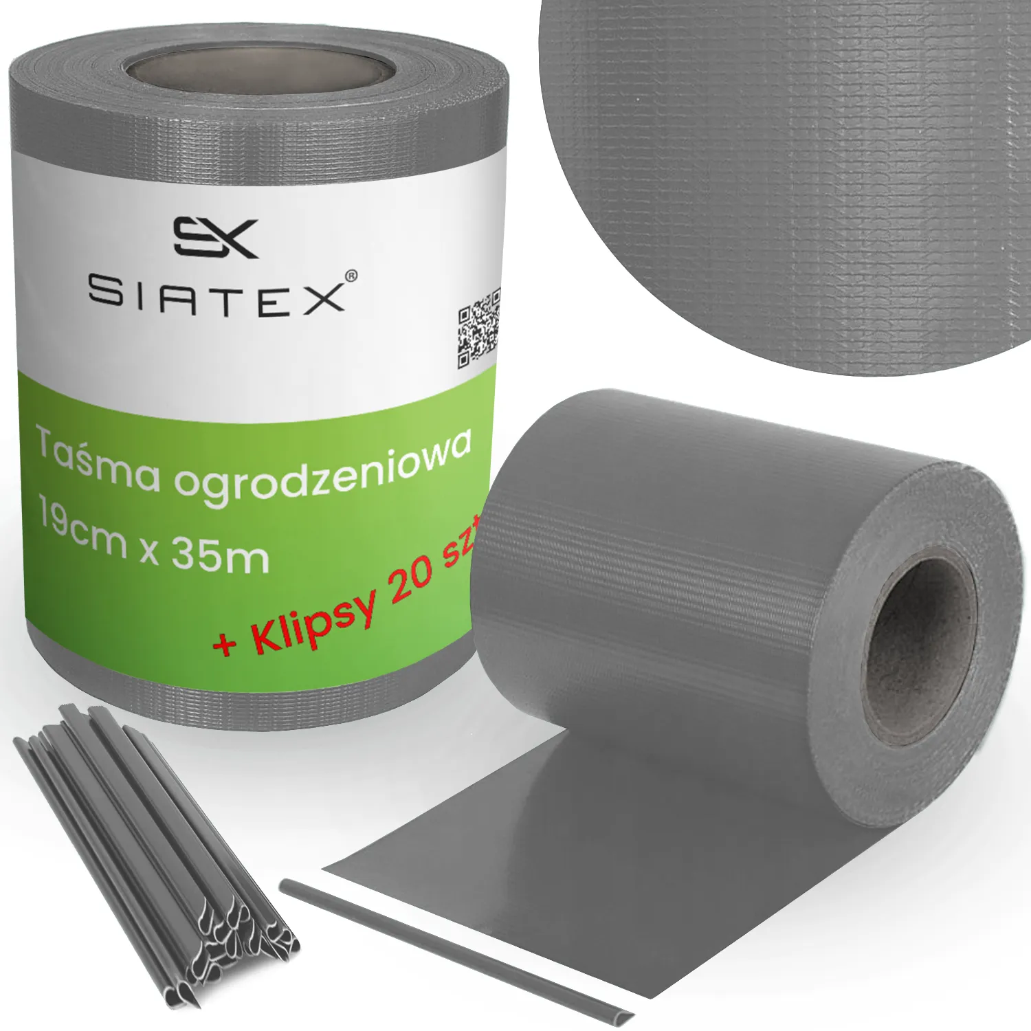 Taśma ogrodzeniowa 19 cm x 35 m + 20 klipsów, szara