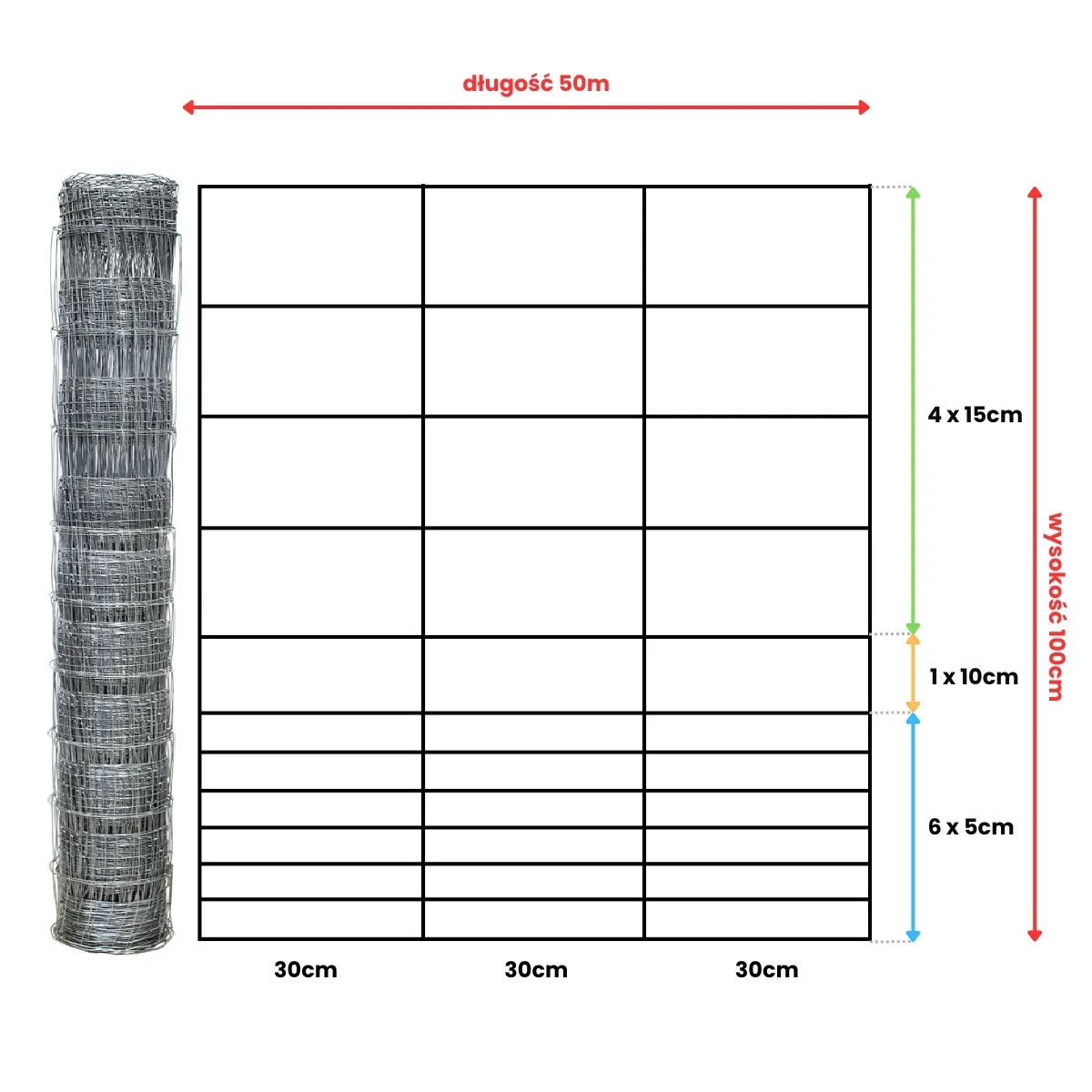 rozstaw drutów poziomych : 6 x 5 cm + 1 x 10 cm + 4 x 15 cm