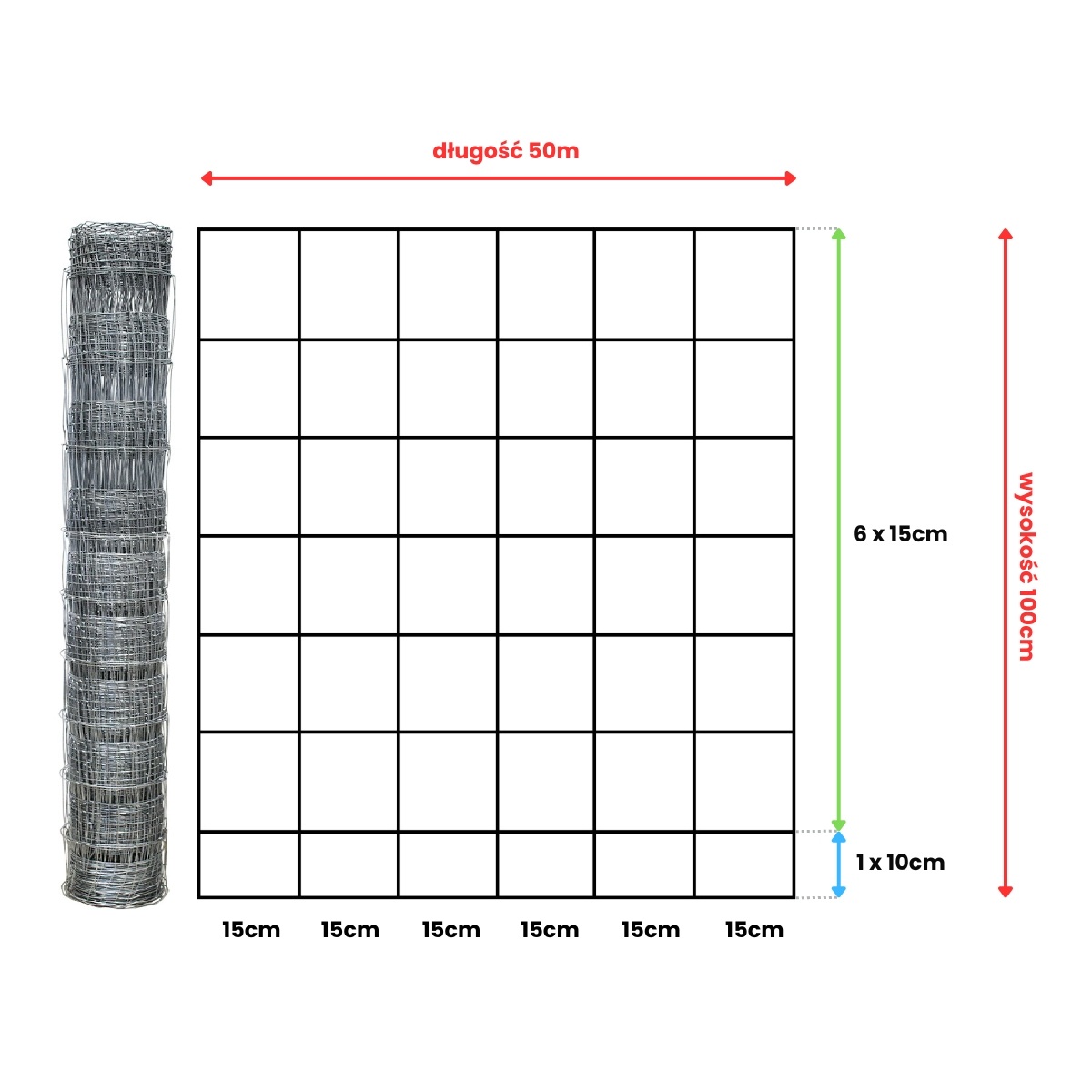 rozstaw drutów poziomych : 1 x 10 cm + 6 x 15 cm