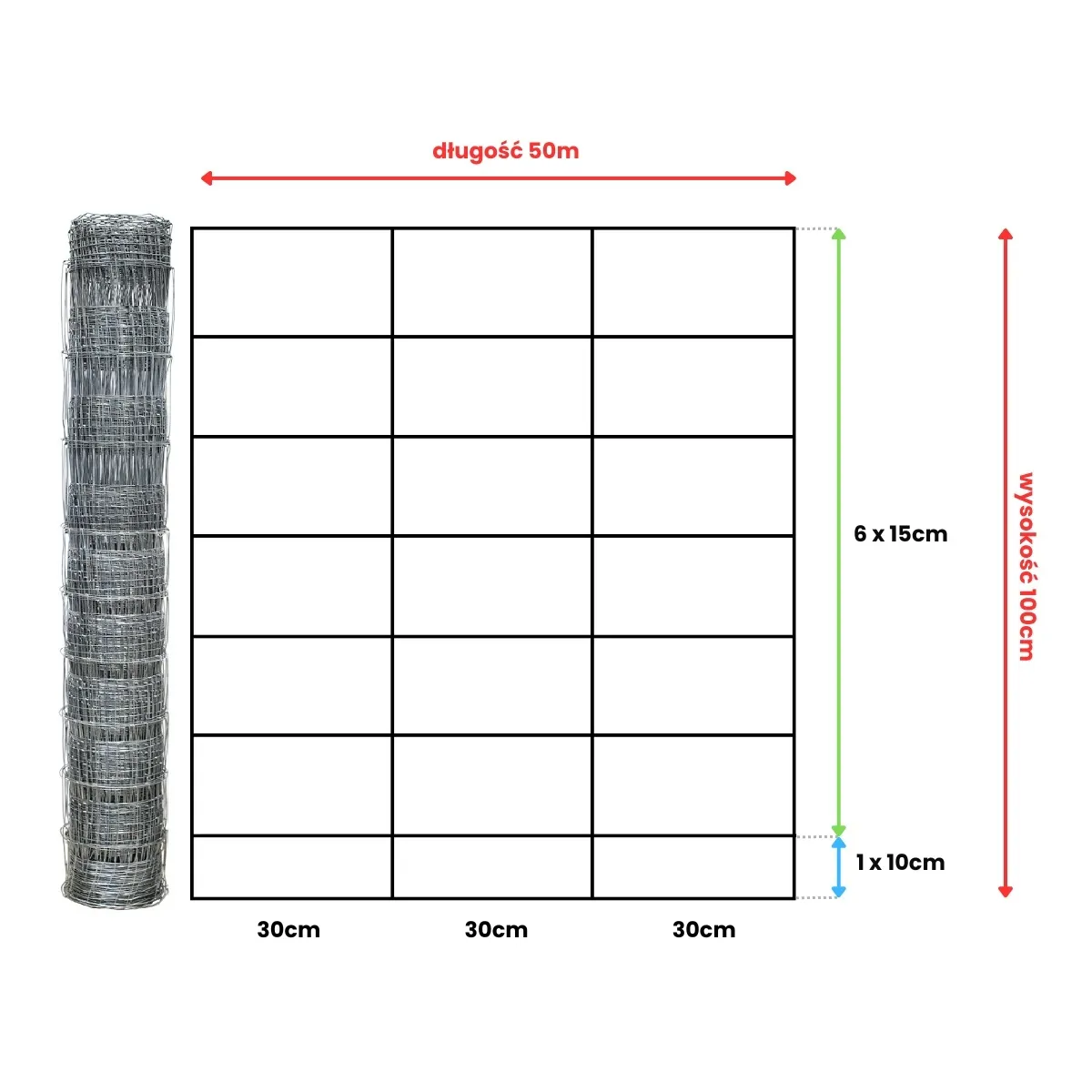 rozstaw drutów poziomych : 1 x 10 cm + 6 x 15 cm