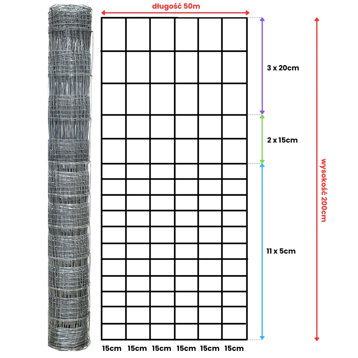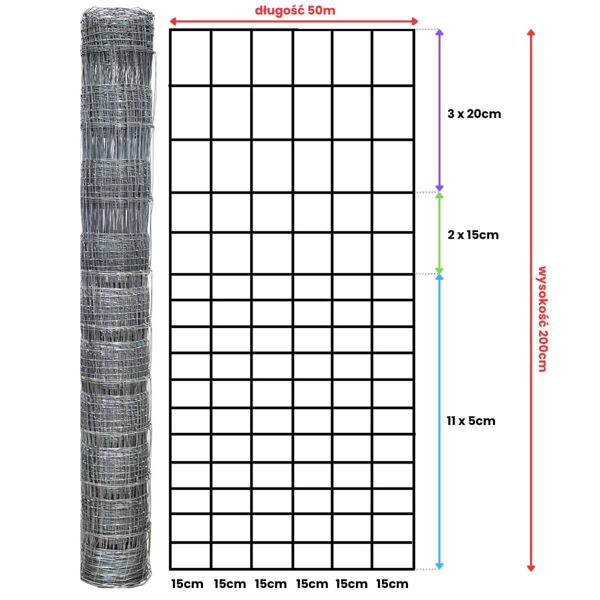 odległość drutów pionowych co 15 cm,